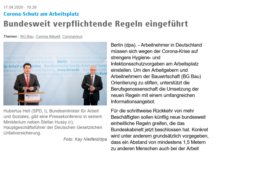 „Arbeitnehmer in Deutschland müssen sich wegen der Corona-Krise auf strengere Hygiene- und Infektionsschutzvorgaben am Arbeitsplatz einstellen. Um den Arbeitgebern und Arbeitnehmern der Bauwirtschaft (BG Bau) Orientierung zu stiften, unterstützt die Berufsgenossenschaft die Umsetzung der neuen Regeln mit einem umfangreichen Informationsangebot.“